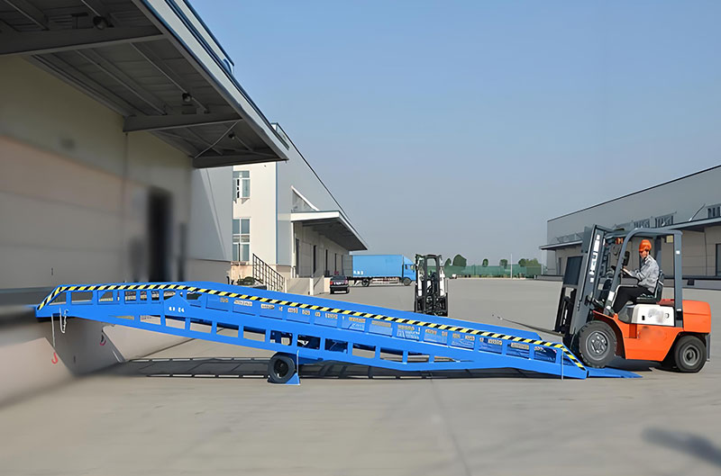 集裝箱登車橋是與叉車配合使用的貨物裝卸專用輔助設備。有了它,叉車能直接從地面駛入汽車車廂內部進行批量裝卸作業。移動登車橋采用人工液壓動力,不需接 動力電源,只需單人操作,即可實現貨物的安全快速裝卸。