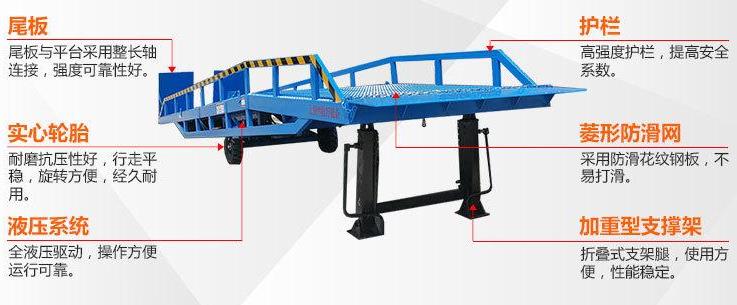 棗莊登車橋-集裝箱裝卸過橋-裝車斜坡登高裝貨叉車液壓登車橋-移動式液壓登車橋應用于無裝卸設備的貨臺及流動裝卸場所,是與叉車配合使用的貨物裝卸輔助設備。借助該設備,叉車能直接駛入汽車車廂內部進行批量裝卸作業(yè)。只需單人操作,不需要動力電源,即可實物的安全快速裝卸。即可使您減輕勞動強度,又能成倍提高裝卸作業(yè)效率,加快物料流通速度,獲取更大經(jīng)濟效.臺面使用特制的菱形網(wǎng)絡板有可靠的強度,能保證長期使用而。它的菱形網(wǎng)狀結構,充分保證了防滑性能,使叉車有更好的爬坡性和可操作性。即使在雨、雪罐子。仍能保證正常使用。